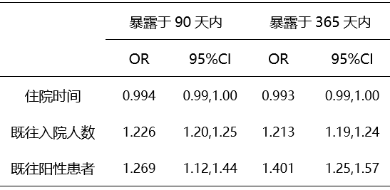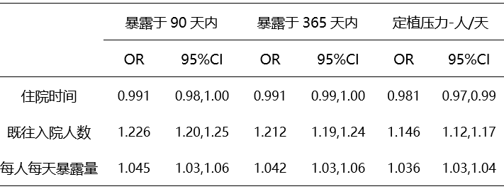 表 2 在过去的 90 天和 365 天里,每增加一天暴露于受污染的房间里以及每天定植压力累积暴露的 CDI 的 OR 值