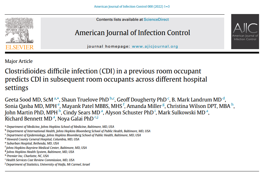 Clostridioides difficile infection (CDI) in a previous room occupant predicts CDI in subsequent room occupants across different hospital settings. Am J Infect Control. 2022 Feb 23:S0196-6553(22)00079-7. doi: 10.1016/j.ajic.2022.02.006. Epub ahead of print. PMID: 35217092.